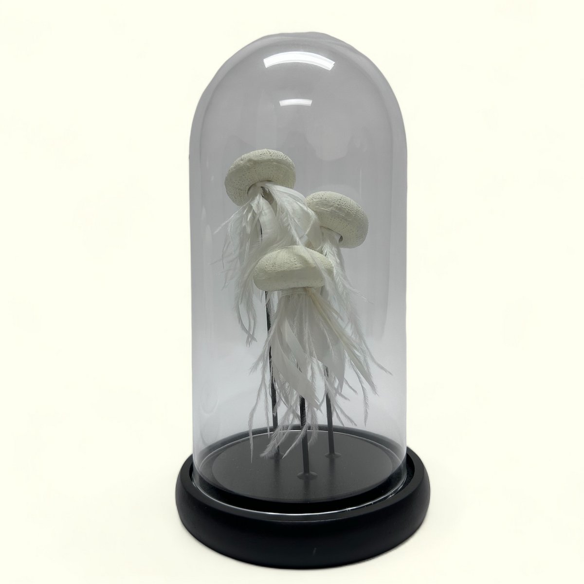 Ontdek de betoverende elegantie van onze nieuwste woondecoratie: de Zwarte Houten Voetstuk met Transparante Glazen Stolp, met drie levensechte witte kwallen, vervaardigd uit fijne veren. De zwart-witte kleurstelling sluit perfect aan bij de hedendaagse interieurtrends en past moeiteloos binnen diverse woonstijlen. Dit kunstzinnige stuk brengt een stijlvolle en moderne touch in elk huis, terwijl het ook een tijdloze schoonheid uitstraalt. Ideaal voor diegenen die hun leefruimte willen verrijken met een stukje natuurlijke grandeur zonder de zorg en onderhoud van echte zeedieren.